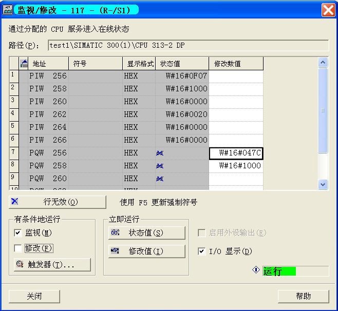 這時寫入 PCD1 控制字(示例中地址為 PQW 256) = W#16#047C(此控制字含義為“運 行”);寫入 PCD2 總線參考值(示例中地址為 PQW 258)= W#16#1000(含義為 25%),然 后按“修改值(I)”按鈕,數據就能傳送至變頻器,如果此時變頻器在 Auto-on 模式,控制 端子 12 與 27 短接,變頻器就能正常運行,而且輸出頻率為 12.5Hz。