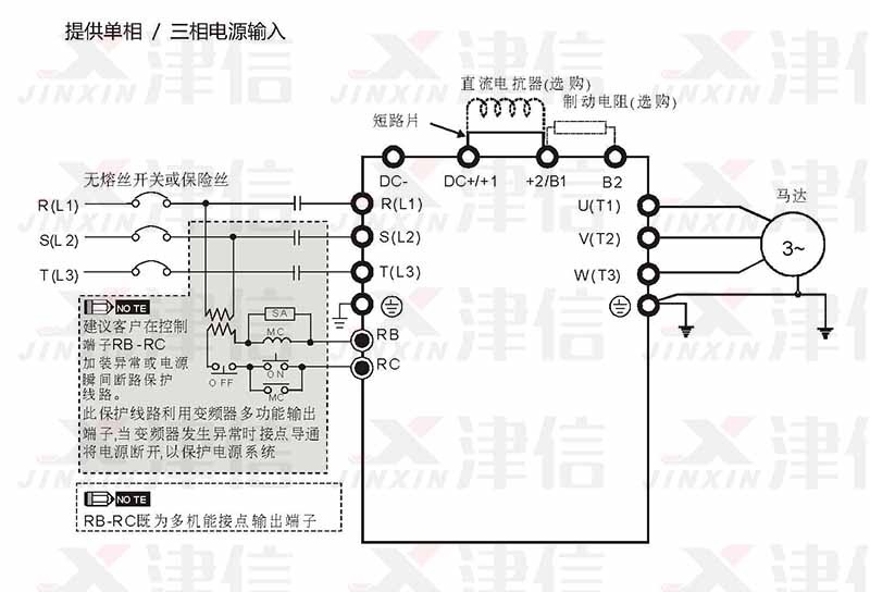 變頻器的主回路電源端子 R/L1、S/L2、T/L3 是輸入電源端。如果將電源錯 誤連接于真E端子,則將損壞變頻器。另外應(yīng)確認電源應(yīng)在銘牌標示的允許