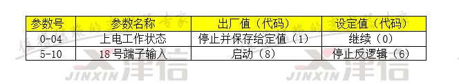 2.外部12 ,18號端子接起停控制開關(guān)。 3. 通過面板按下面的參數(shù)分別在0號菜單設(shè)置上電工作狀態(tài),5號菜單設(shè)置18號端子輸入值。