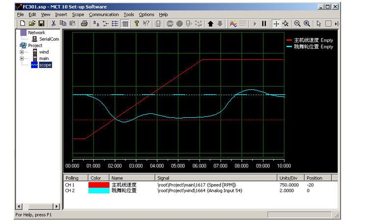 卷繞控制的特點(diǎn):同樣的一套PID調(diào)節(jié)參數(shù),勻速時(shí)易于穩(wěn)定,波動(dòng)也較小;而加速時(shí)就不易于穩(wěn)定,而且因?yàn)樘栎單恢糜徐o差,波動(dòng)幅度也較大。因此PID調(diào)節(jié)參數(shù)主要針對(duì)加減速過程予以優(yōu)化。MCT軟件有數(shù)字示波器功能,通過實(shí)時(shí)觀測(cè)線速度和跳舞輪位置在加減速時(shí)的變化曲線,能很方便地調(diào)整調(diào)節(jié)參數(shù)。