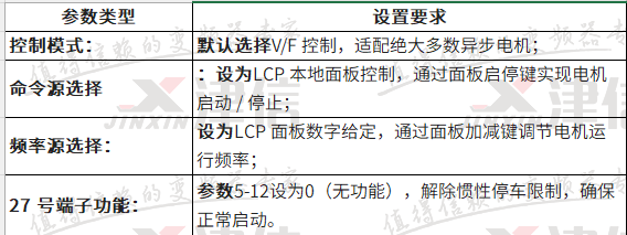 — 慣性停車端子:27 號端子默認(rèn)帶安全停車功能,需將參數(shù)5-12設(shè)為 0(無功能),避免啟動被限制;