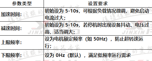 — 點動(JOG)參數(shù):設(shè)置點動頻率(5-10Hz)、點動加減速時間(2-3s),方便現(xiàn)場轉(zhuǎn)向測試;