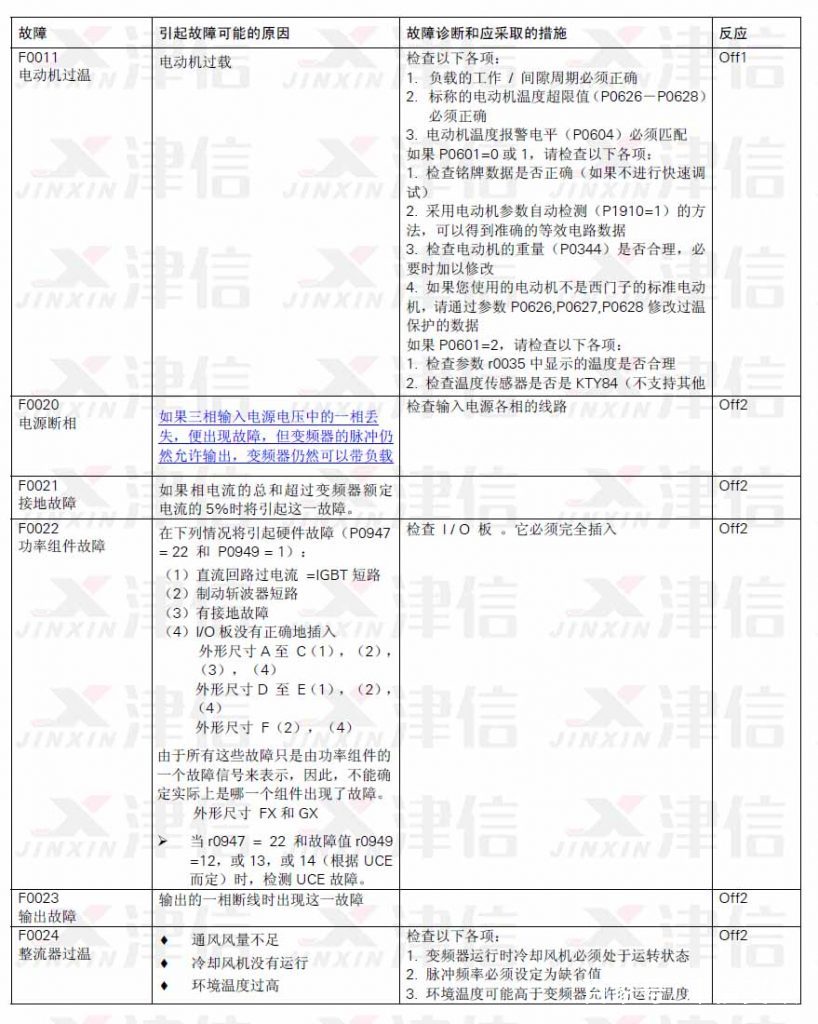 二、F0011電動機過溫,F0020電源斷相,F0021接地故障,F0022功率組件故障,F0023輸出故障,F0024整流器過溫