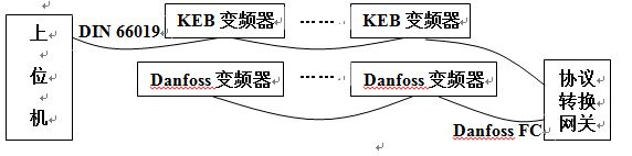 為了節省投資,變頻器替換采取逐步進行方式,即損壞一臺KEB變頻器,替換一臺。也就是說系統中將同時存在兩種變頻器和兩種協議。現在要開發的通訊協議轉換網關就是要使其對上位機而言,丹佛斯依然被視作DIN 66019協議的數據設備;而對于Danfoss變頻器而言,還是在Danfoss FC協議控制下工作。此外,根據功能需求分析,該協議轉換網關需要具有伸縮性,即增加Danfoss變頻器時,需要將新增加的Danfoss變頻器包裝成DIN 66019協議下的設備,而不管丹佛斯變頻器的數量多少,在上位機看來,它們應該是DIN 66019協議下的與原KEB變頻器沒有任何沖突的設備。兩種協議并存的結構框圖如圖2所示。