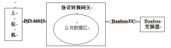 為了實現高效的通訊應答控制,同時為了使程序結構簡明、清晰,協議轉換程序采用多線程結構。在存儲器中開辟出一塊公共數據區,用于兩個相對獨立的通訊線程的數據存取與共享。線程1為上位機與網關之間的通訊線程,采用DIN66019協議,當上位機發指令時,線程1將上位機的指令存入公共數據區,然后應答上位機;當上位機讀取數據時,線程1立即將公共數據區內的相關數據發送回上位機。另一個線程為網關與Danfoss變頻器之間的通訊線程,采用Danfoss FC協議,網關從公共數據區取得來自上位機的指令,轉為FC協議數據發送至Danfoss變頻器,Danfoss變頻器在收到指令之后應答網關;空閑時網關連續讀取變頻器的狀態和運行數據刷新公共數據區。結構框圖如圖4所示。