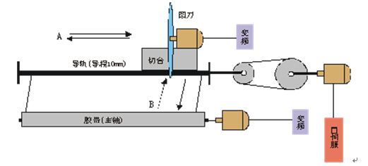 主軸電機用VFD-015M23A驅(qū)動,切臺上的圓刀(切刀)用VFD-007M23A驅(qū)動,伺服與齒輪同軸相連,通過齒輪皮帶帶動導(dǎo)軌,使切臺在如圖中A所示方向來回移動,用來完成定長的操作。同時切臺通過油壓可以在如圖中B所示方向前后移動,用來對套在主軸上的膠帶進行切割。