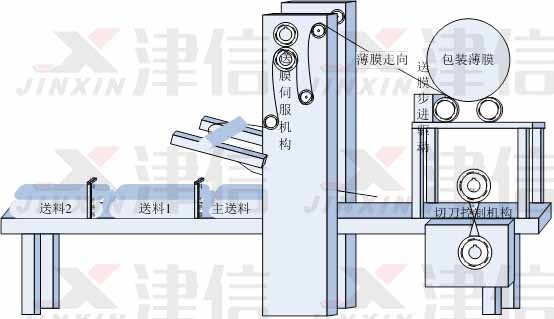 枕式包裝機主體基本上有送料部分、送膜部分和裁切部分構(gòu)成,如圖1所示。所有的動作邏輯及相位控制均以主送料軸的主軸編碼器信號為參考進行控制。本文將就臺達A2伺服內(nèi)置電子凸輪功能的應(yīng)用加以闡述。其內(nèi)置電子凸輪功能,具有低成本和高靈活性的優(yōu)勢。