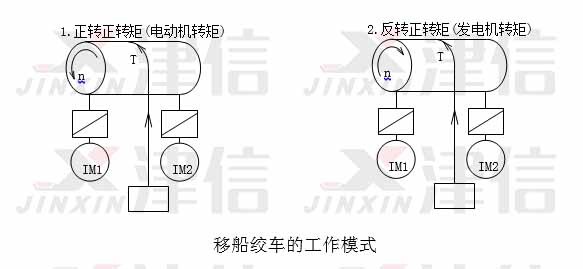移船絞車是重要的海工設(shè)備,在海上工作平臺、鋪管船里有廣泛的應(yīng)用。移船絞車的工況與起升相似,正轉(zhuǎn)時(shí)收線,變頻器工作于電動機(jī)模式,電機(jī)對負(fù)載作功;反轉(zhuǎn)時(shí)放線,變頻器工作于發(fā)電機(jī)機(jī)模式,負(fù)載對電機(jī)做功,要求變頻器內(nèi)置制動晶體管。與普通起升不同的是,移船絞車連續(xù)工作時(shí)間很長(數(shù)小時(shí)),所以對于變頻器的過載能力要求不高,但是要求變頻器具有100%制動轉(zhuǎn)矩連續(xù)運(yùn)行的能力。