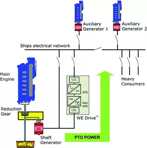 VACON®NXP電網變流器由VACON® AFE單元、船舶電網上的LCL濾波器以及專用軟件組成。集成了AFE/逆變器與VACON®NXP電網變流器的套件被安裝在軸帶發電機和船舶電網之間。如圖所示,通過兩個輔助發電機和軸帶發電機的幫助,為重載耗電設備提供恒壓恒頻的電力。