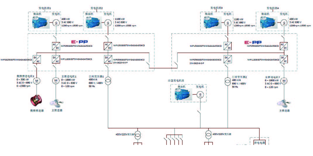 該船的直流電推系統的核心部件變頻器采用了VACON水冷共直流母線變頻產品。VACON變頻器是全球最早用于船舶直流組網電推系統的變頻產品,業績眾多并積累了豐富的經驗。用于直流電推的變頻器硬件結構都為直流-交流IGBT功率轉換裝置,根據不同的應用加裝不同的應用宏。該船發電機采用異步發電機,用于連接發電機到直流母排的整流器加裝發電機應用宏,發電機的電壓和頻率范圍都可調節并且范圍寬廣,完美實現變速發電機組的根據實際負荷變化的運行要求。整流器前端無需前置LCL或者正弦波濾波器,節省體積與成本。用于主推進和側推的逆變器加裝船舶應用宏,可以精確的控制推進器并且具有恒功率控制,轉矩限制等功能。用于電源的2個逆變器加裝并網變流器應用宏,后端加正弦波濾波器和隔離變壓器組成變頻電源可以給全船其他負載提供純凈的交流電。并且可以和應急發電機組并聯運行。